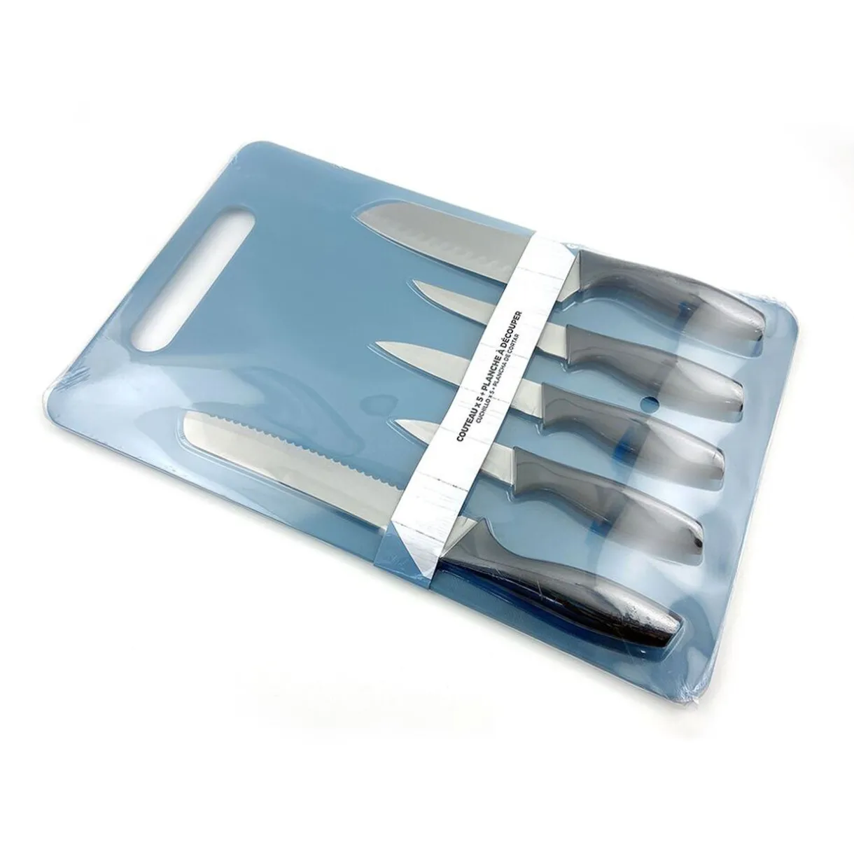 Soyez équipé pour couper tous vos aliments avec cette planche et ses 5 couteaux :