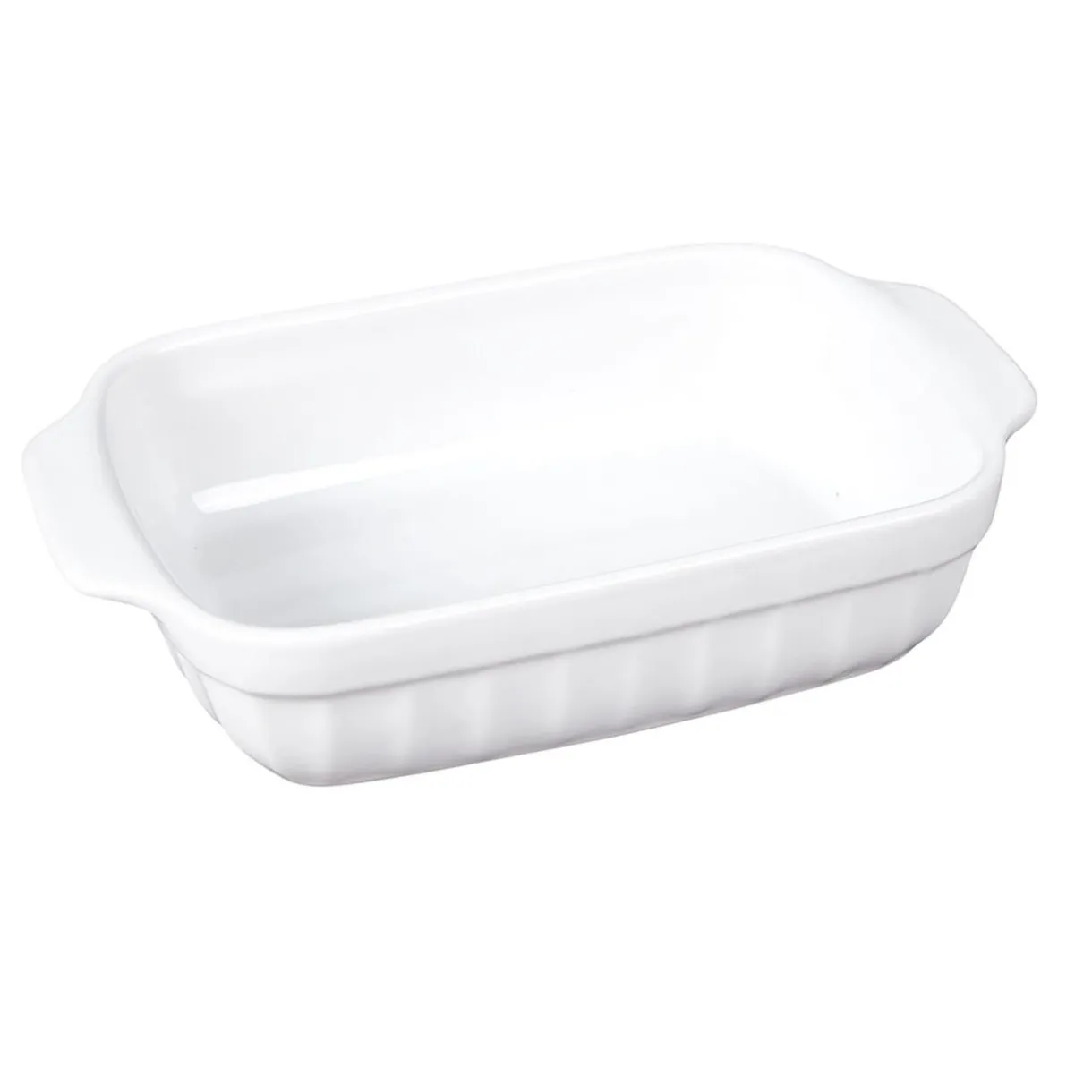 Plat à four rectangulaire en céramique de couleur blanche composé de grès émaillé.
