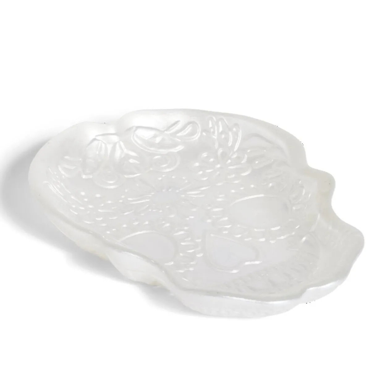 Apportez une touche de fantaisie à votre soirée d’Halloween avec ce plat blanc en forme de tête de mort mexicaine.