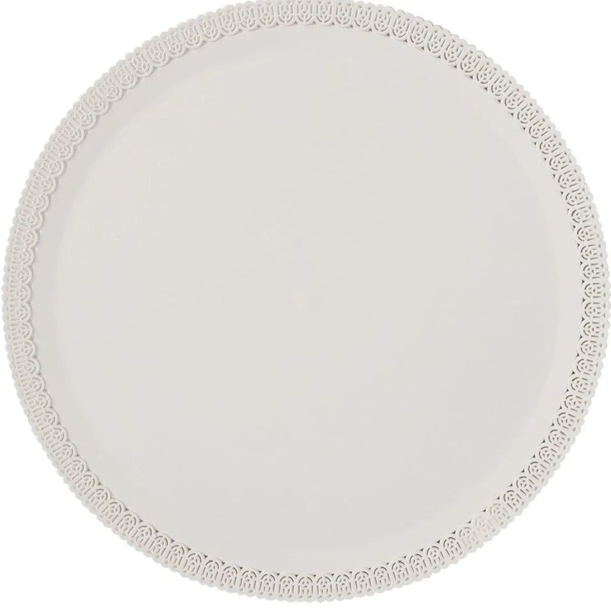 Plateau de présentation pour gâteau rond en plastique blanc avec joli décor en relief sur tout le contour.