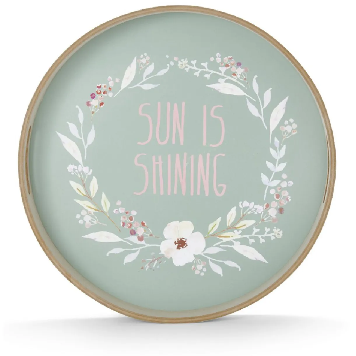 Envie de prendre l’apéritif sur la terrasse sans faire d’innombrables aller-retour ? Utilisez ce plateau rond en bois au design doux et jovial avec « sun is shining » (le soleil brille) inscrit au centre d’une délicate couronne de fleur.