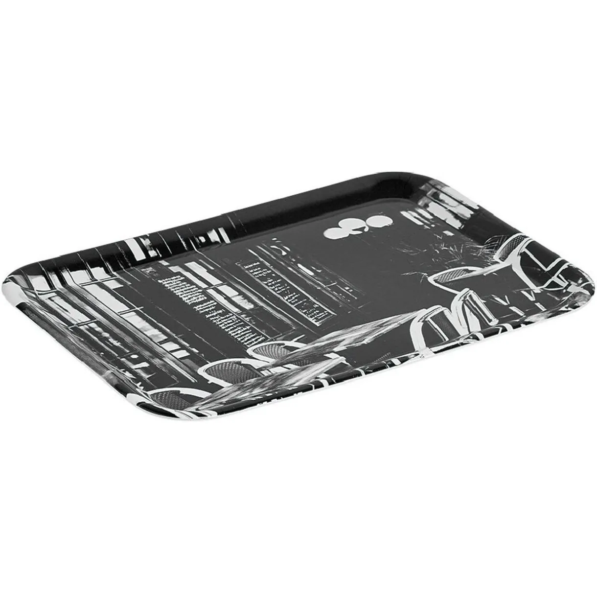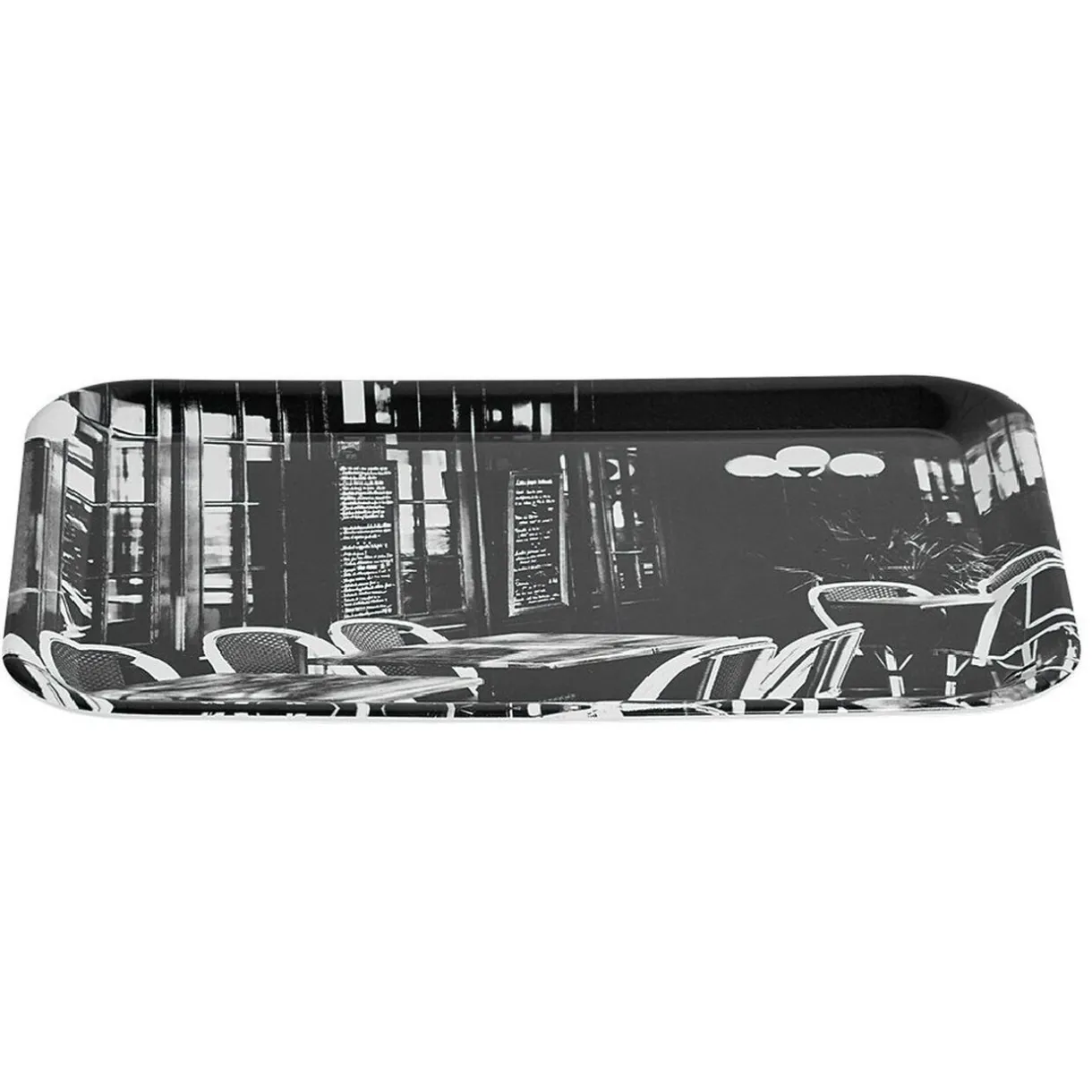 Plateau en plastique mélamine design bistrot de couleur noir et blanc.