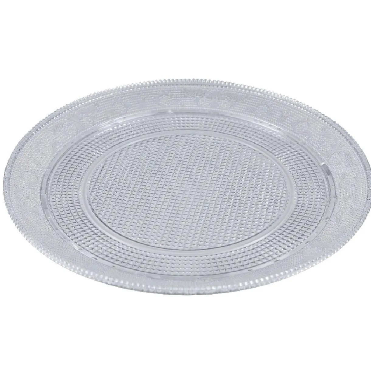 Plateau rond transparent au design luxueux.