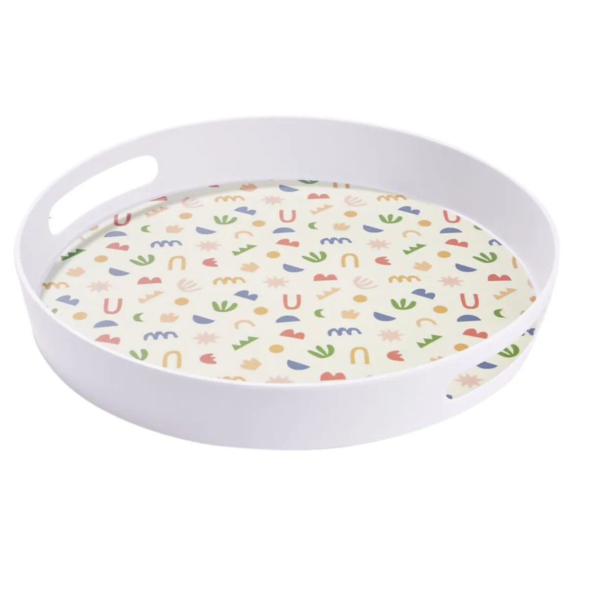 Égayez vos repas avec ce plateau rond blanc en mélaminé décoré de motifs multicolores inspirés de Matisse.