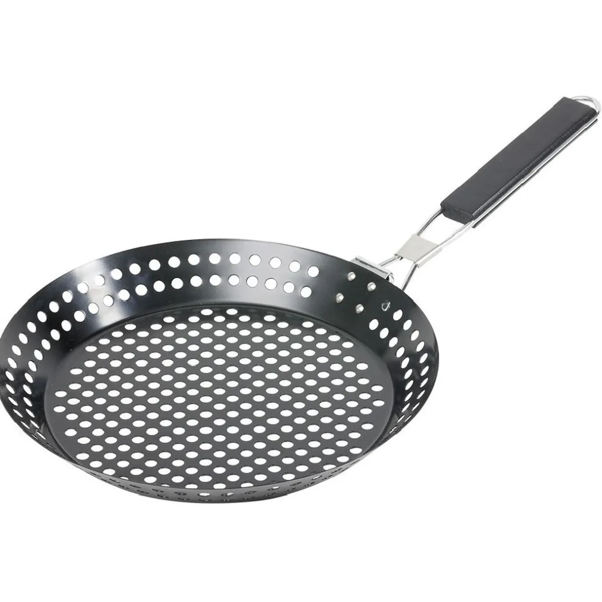 Poêle à trous fabriquée en acier au carbone avec revêtement antiadhésif pour cuire les marrons et chataîgnes au feu de bois.