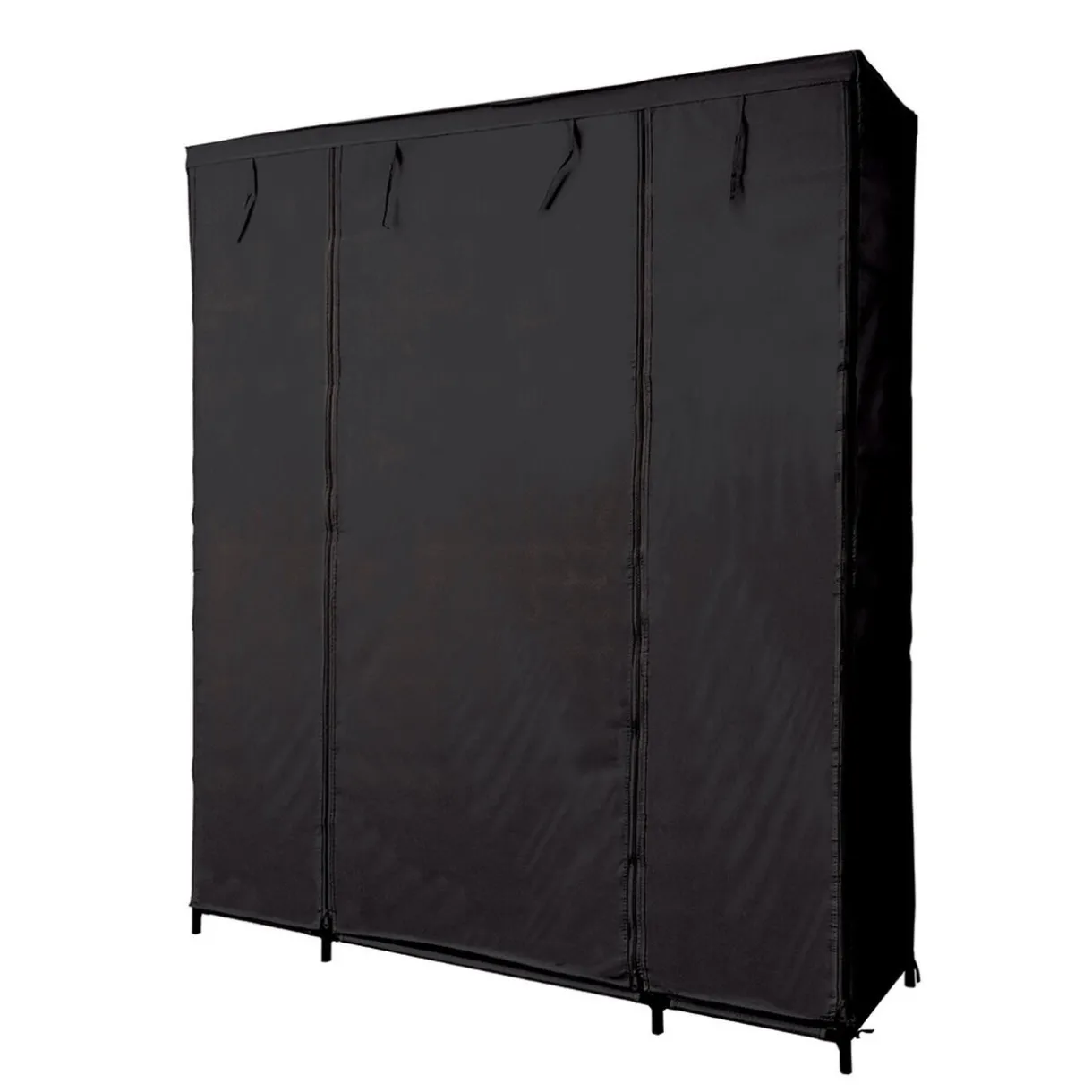 Armoire dressing en tissu de couleur noire. Vous pourrez entreposer vos vêtements sur cintres grâce à sa barre de penderie, et ranger vos affaires pliées sur les 10 étagères en tissu. Aussi équipée de trois panières, vous pourrez y stocker vos sous-vêtements par exemple. De plus, pour éviter que vos affaires ne prennent la poussière, cette armoire est totalement refermable par sa devanture en dessus.