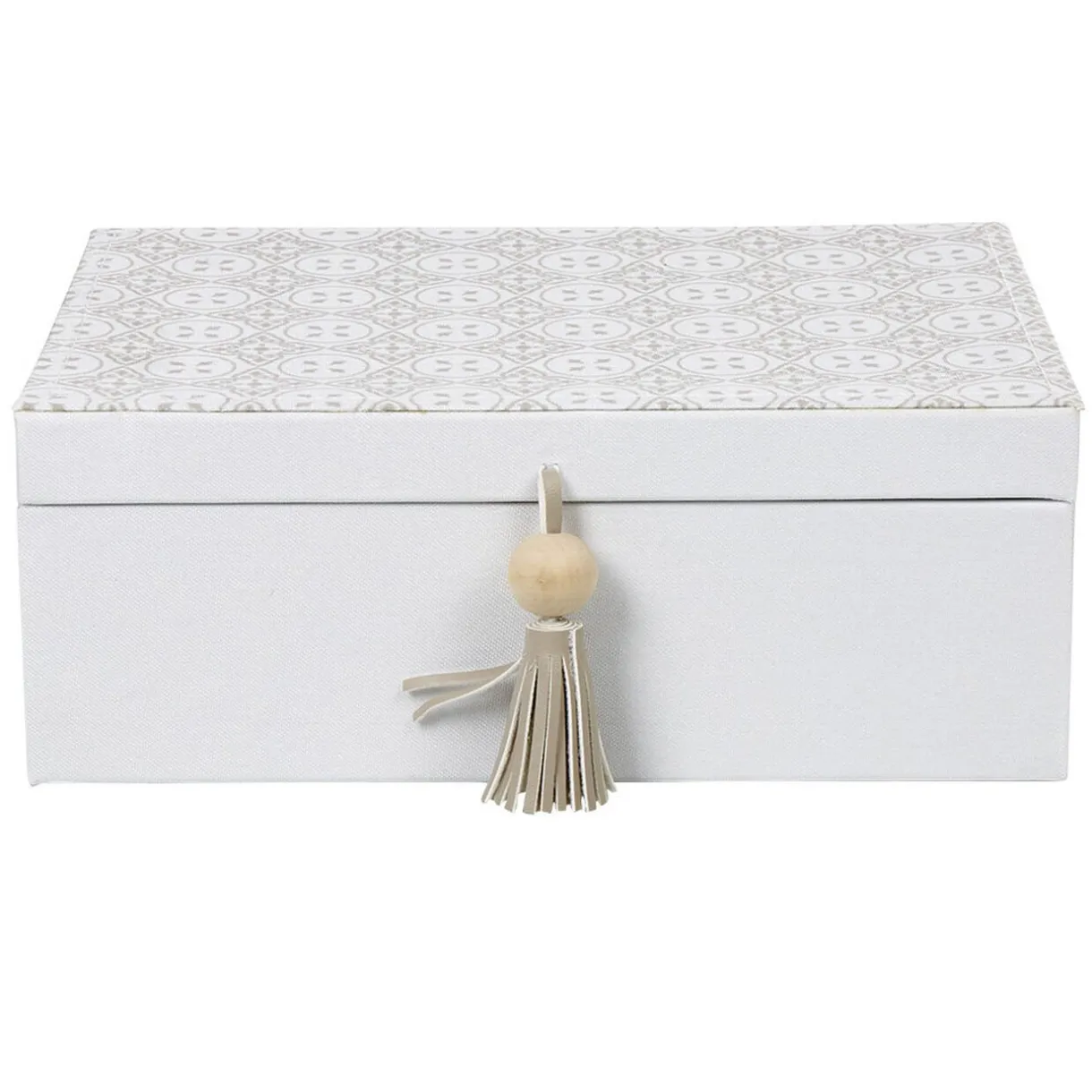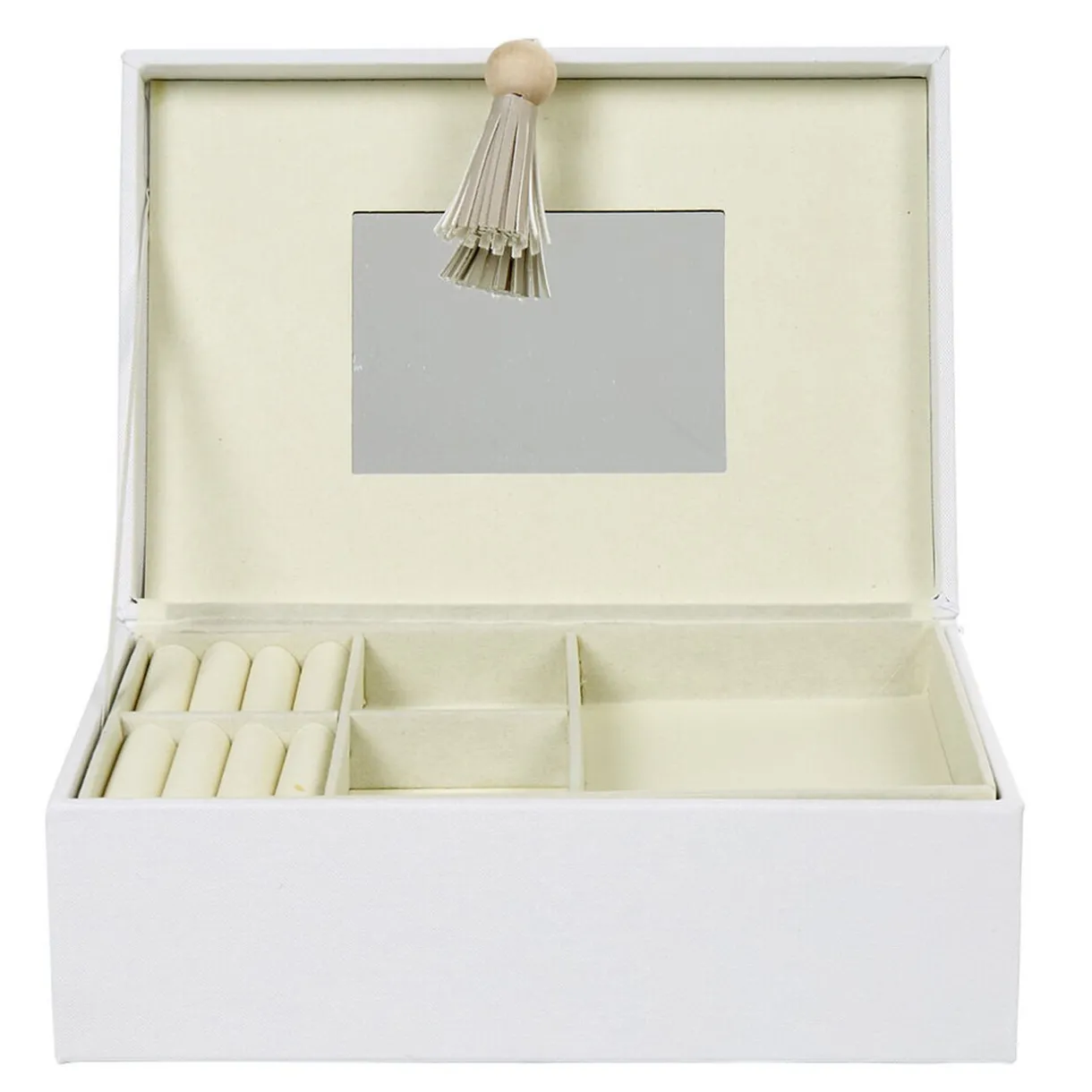 Boîte à bijoux blanche et grise avec ouverture déco à pompon.