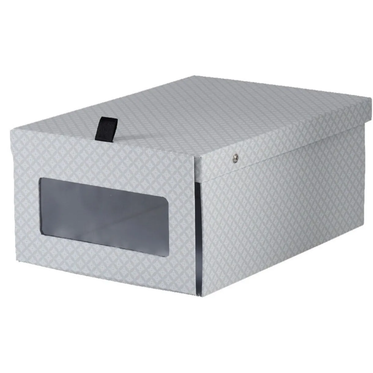 Boîte à chaussures à motifs gris et bleus, avec fenêtre transparente et fermeture aimantée.