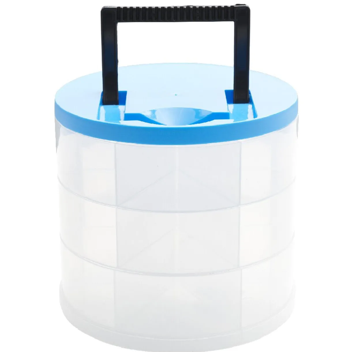 Boîte de rangement transparente avec couvercle coloré.
