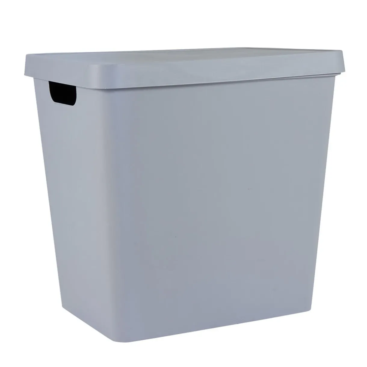 Optimisez votre rangement avec cette boîte en plastique grise munie d’un couvercle.