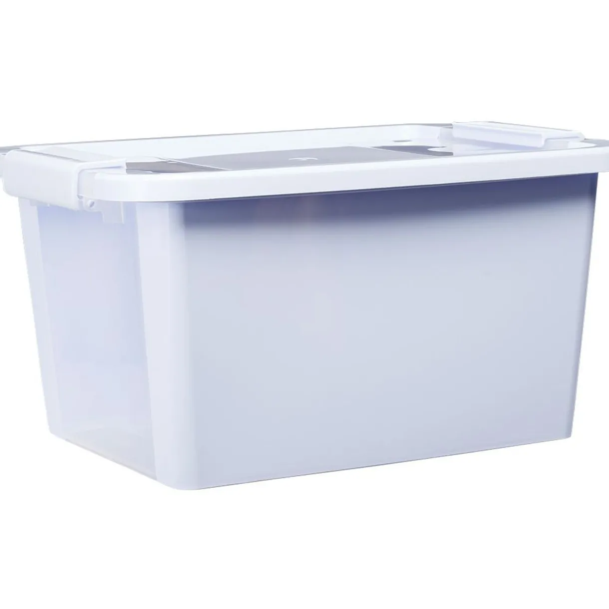 Boîte de rangement en plastique de couleur lavande avec couvercle et parois partiellement transparents permettant de voir le contenu. Fermeture et ouverture facile par 2 clips.