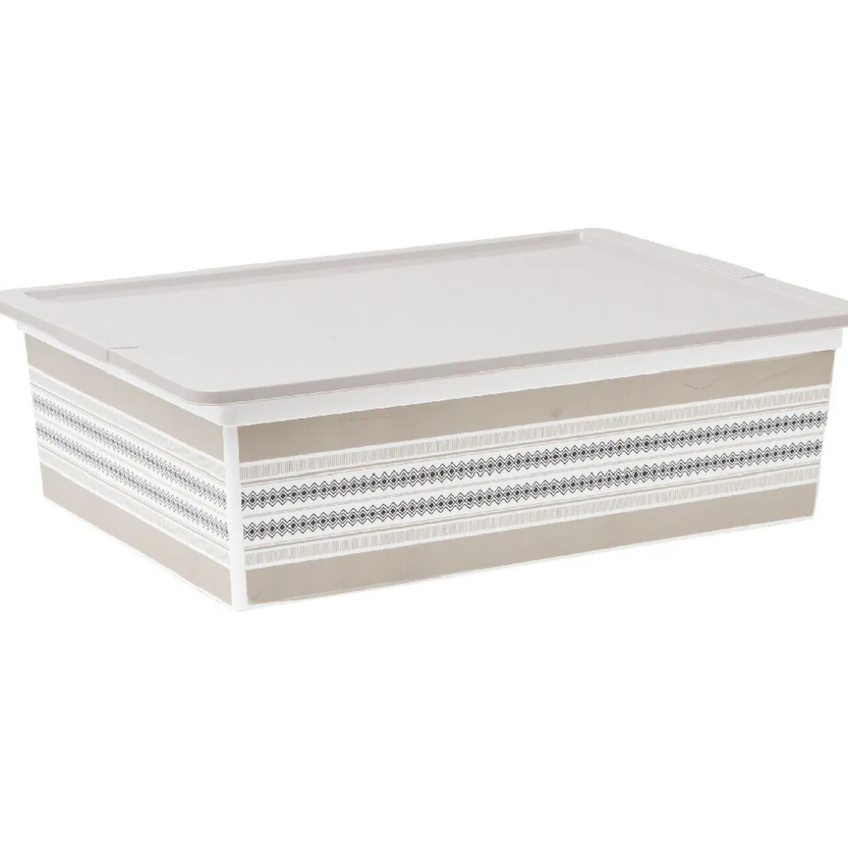 Boîte de rangement de couleur blanc, beige et noir à motifs.