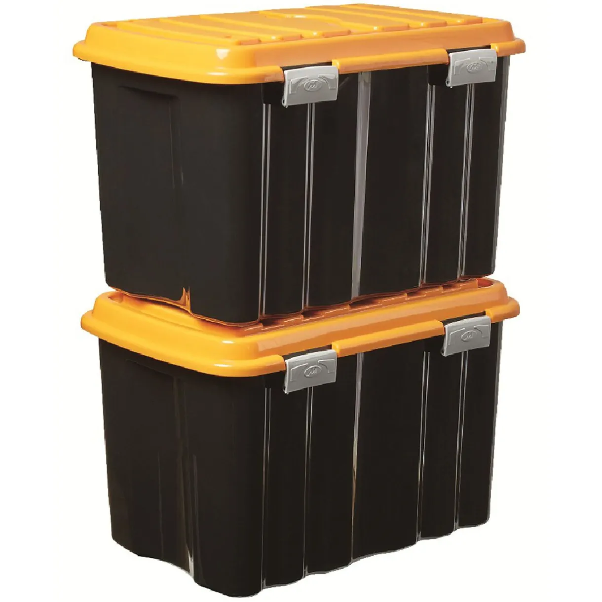 Doublez votre capacité de stockage pour vos outils et accessoires de bricolage grâce à ce lot de 2 boîtes de rangement noires au couvercle orange. Elles disposent chacune d’une contenance de 54 L et d’une fermeture à clips.