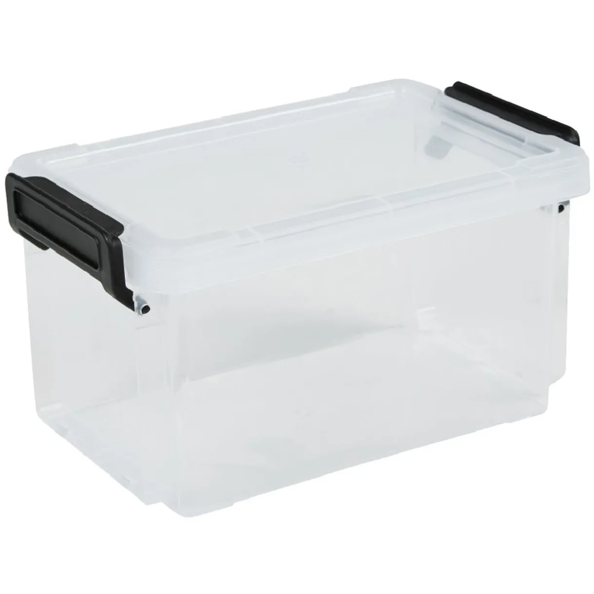 Boite de rangement transparente avec couvercle à fermeture par clips.