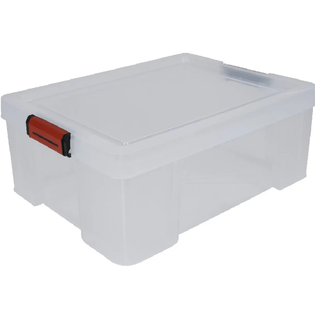 Boîte de rangement transparente avec couvercle à fermeture par clips sécurisée.