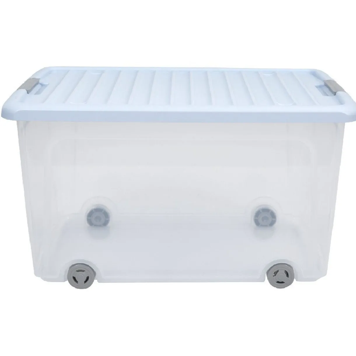 Box de rangement à roulettes transparent avec couvercle bleu.