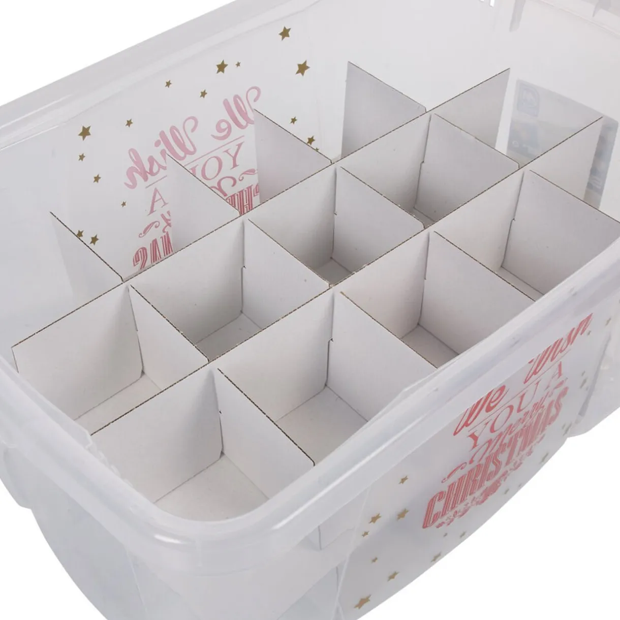 Box de rangement transparent déco étoiles avec couvercle doré et roulettes.Idéal pour le rangement de votre décoration de Noël.