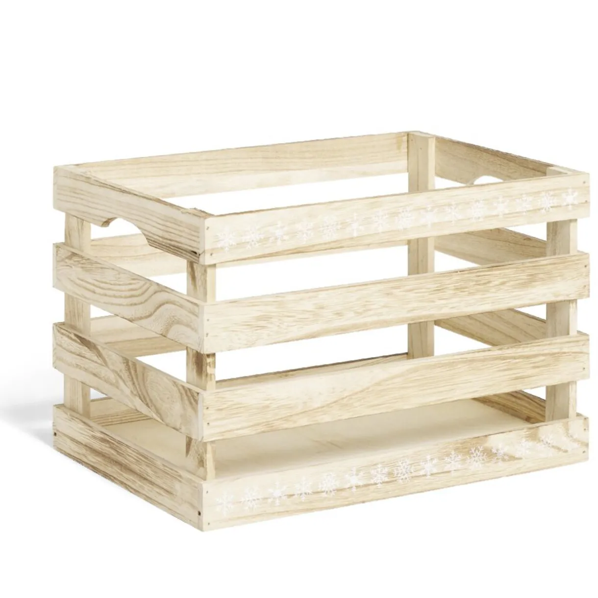 Cette caisse de rangement en bois à motifs flocons blancs est idéale pour apporter une touche rustique à votre déco hivernale.