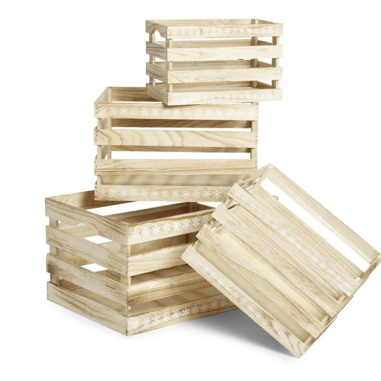 Pour une touche décorative dans un style hivernal, optez pour cette caisse de rangement en bois à motifs flocons blancs.