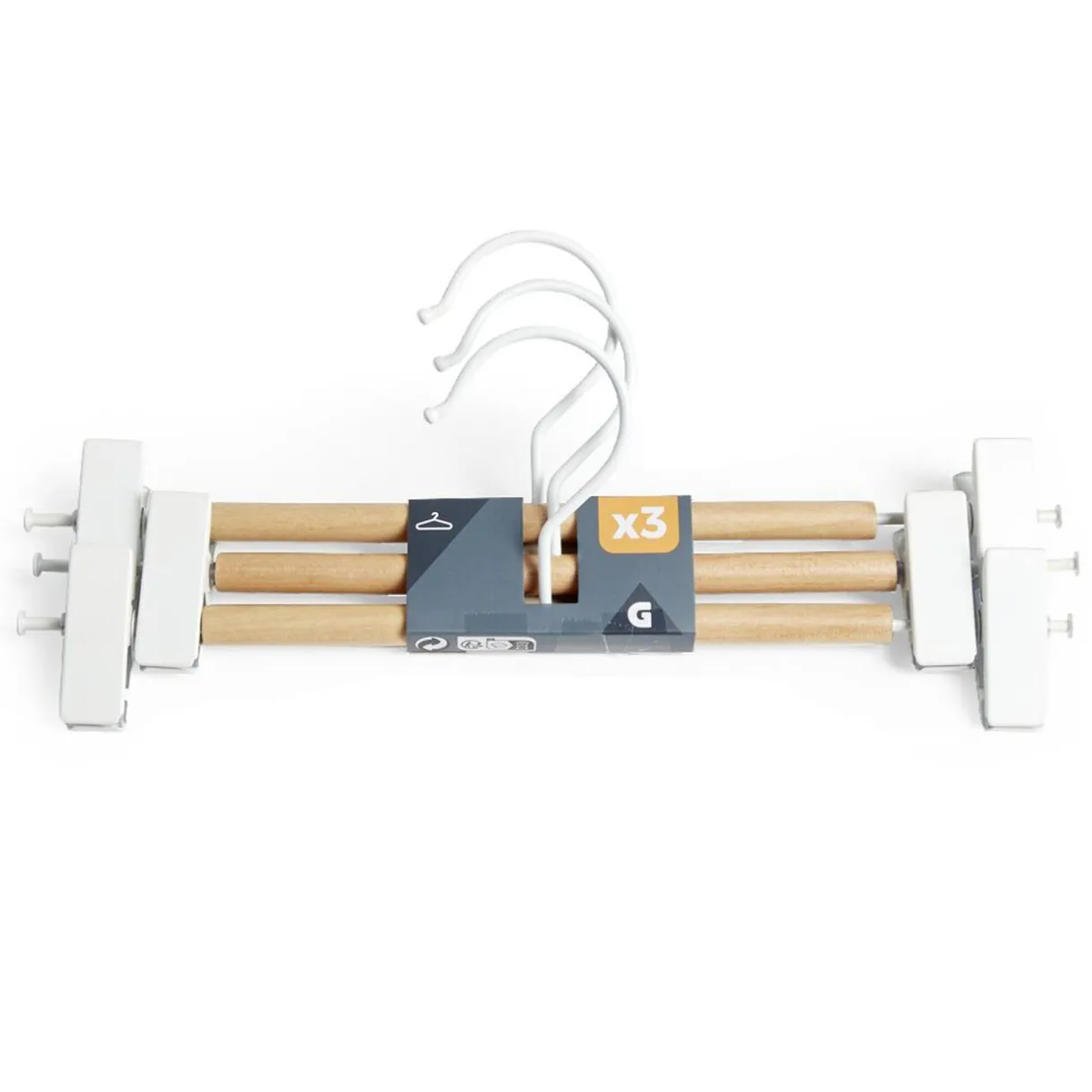Accrochez vos vêtements avec élégance avec ce lot de 3 cintres à pinces en métal blanc et en bois naturel.