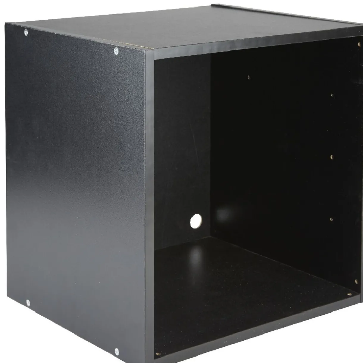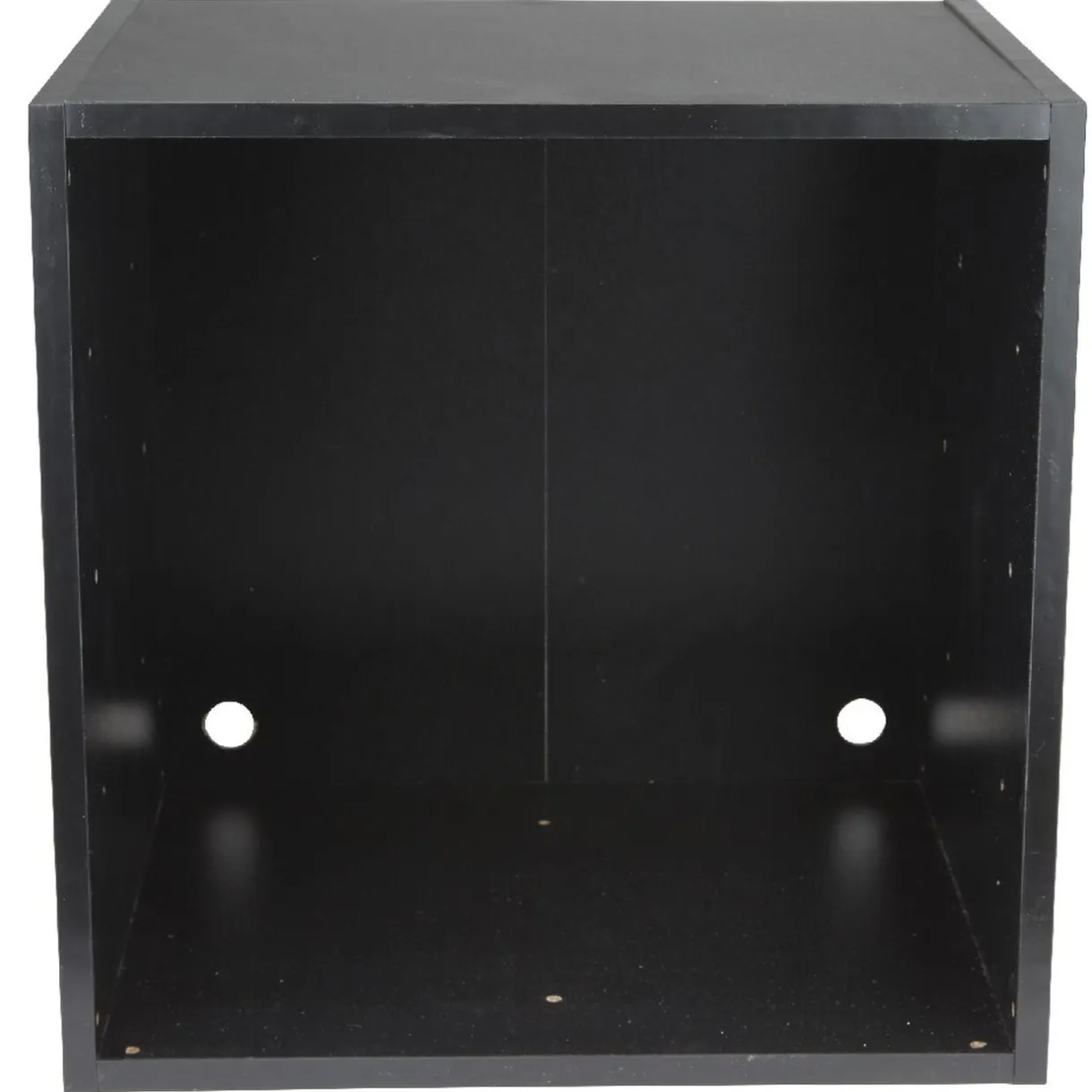 Cube étagère de rangement en panneaux de particules de bois noir.