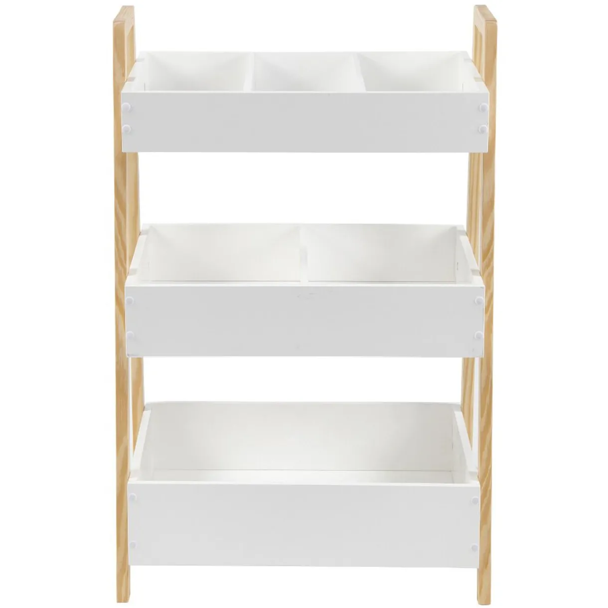 Design et pratique pour organiser votre espace, cette desserte à 3 niveaux en mdf et pin bicolore blanc naturel saura trouver sa place dans tous les espaces. Équipée d’un grand bac et deux autres compartimentés, elle vous servira de bibliothèque, étagère à jouets dans une chambre, de rangement supplémentaire dans le séjour ou encore pour organiser vos produits de beauté dans la salle de bain… A vous de choisir l’emplacement idéal de cette desserte au charme naturel et cosy pour votre intérieur!