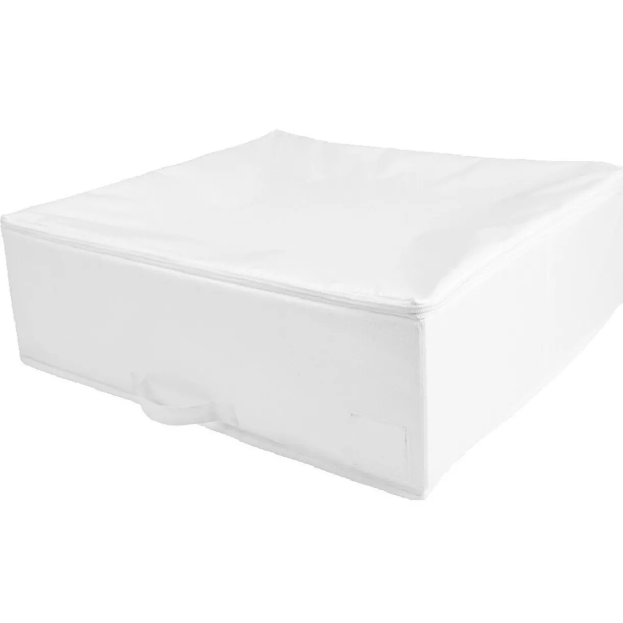 Housse de rangement rigide en tissu synthétique blanc, parfait pour y entreposer vos vêtements d’hiver et couvertures l’été !