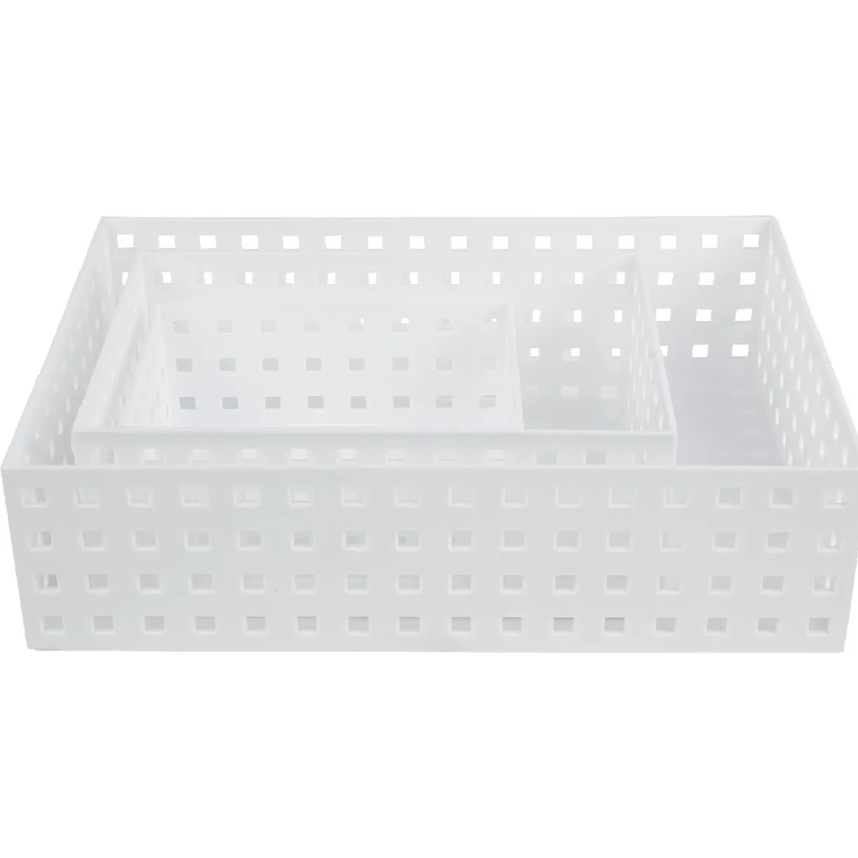 Ces 3 panières blanches de tailles différentes sont modulables et s’empilent pour créer un mode de rangement unique. Sur un bureau, rangez-y enveloppes, fournitures et stylos… Sur votre commode, rangez-y ceintures, cravates et chaussettes.
