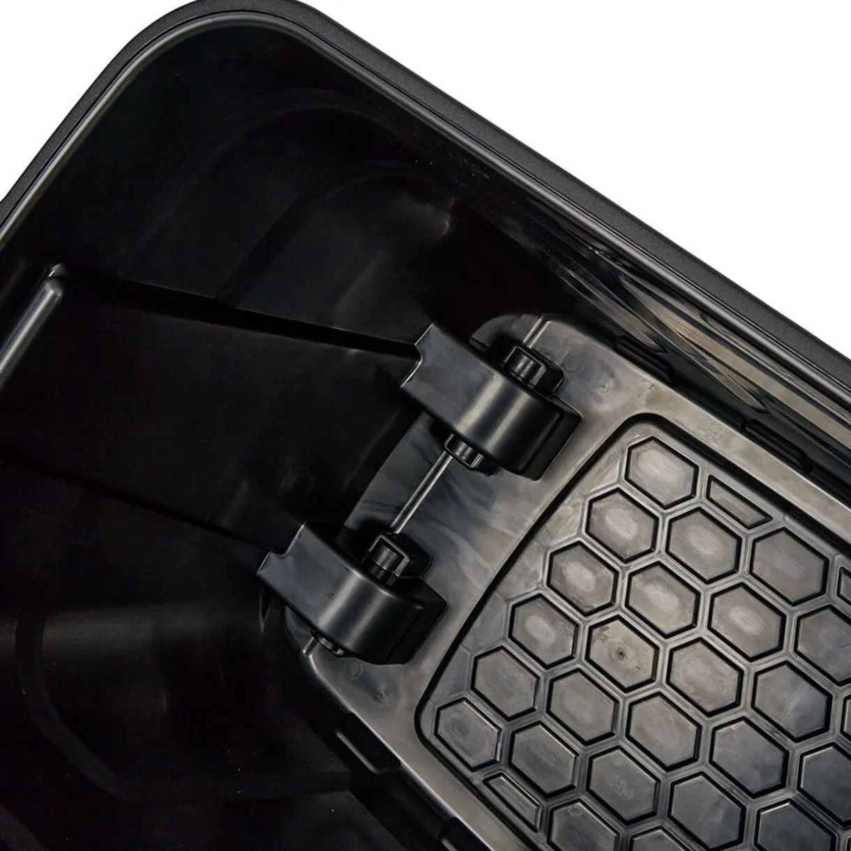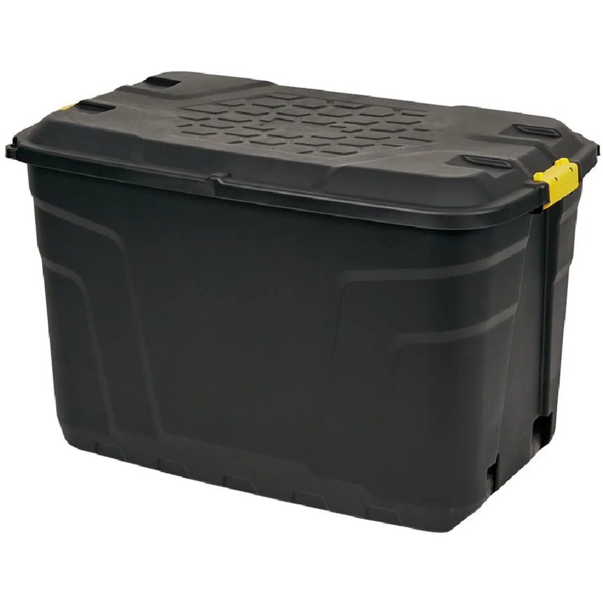 Idéale pour le garage ou un atelier, cette malle résistante 100% en polypropylène recyclé noir d’une contenance de 190 litres avec fermeture à clips jaunes vous apportera un rangement indéniable.