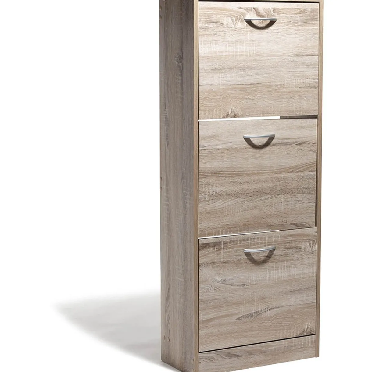 Grâce au meuble à chaussures Utah, rangez tous vos souliers ! Utilisez le design moderne de ce meuble afin de disposer tous vos baskets, vos ballerines ou encore vos sandales. Dans votre couloir ou votre chambre à coucher, il trouvera aisément sa place tout en embellissant votre pièce. Les 3 tiroirs répartis sur une colonne vous proposent de grands espaces de rangement que vous pouvez utiliser selon vos besoins et selon votre organisation. Peu encombrant, ce meuble vous permettra de glisser jusqu’à 12 paires de chaussures. En panneaux de particules, sa structure est revêtue de papier décor afin de lui apporter une protection supplémentaire. Sa couleur naturelle le rend idéal pour toutes sortes de décoration. Selon votre ameublement, vous pouvez utiliser ce meuble afin d’obtenir un design de pièce haut en couleur ou rustique. Si vous souhaitez harmoniser votre pièce, découvrez les autres meubles de la gamme Utah que vous pouvez associer avec celui-ci, tels que la table basse, l’étagère ou encore la commode.