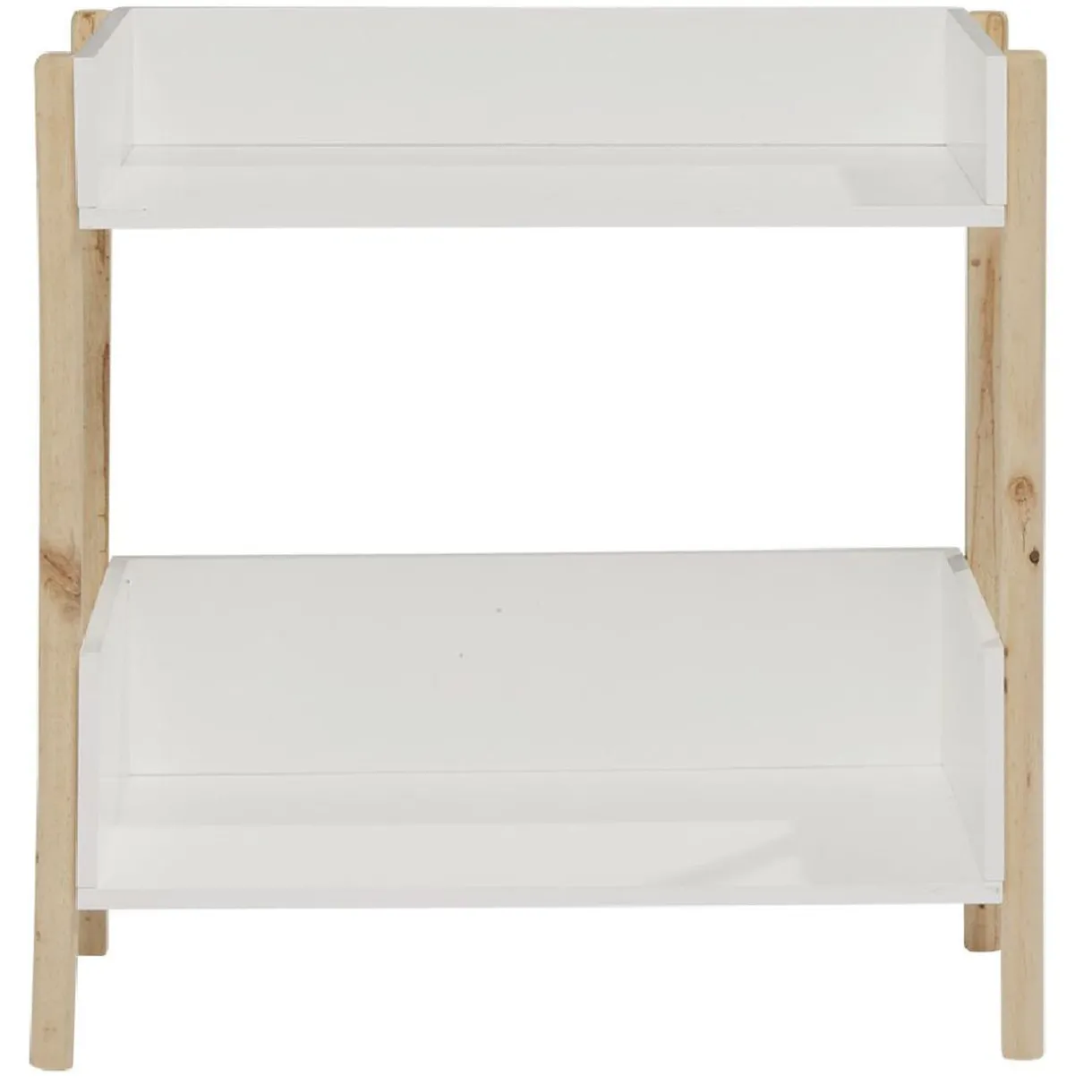 Meuble de rangement en bois sur deux niveaux de couleur blanche avec pieds couleur naturelle.