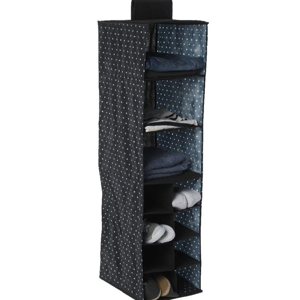 Organisateur de penderie noir motifs étoiles blanches, 11 compartiments, dim. 35x31xh.108 cm, polypropylène.