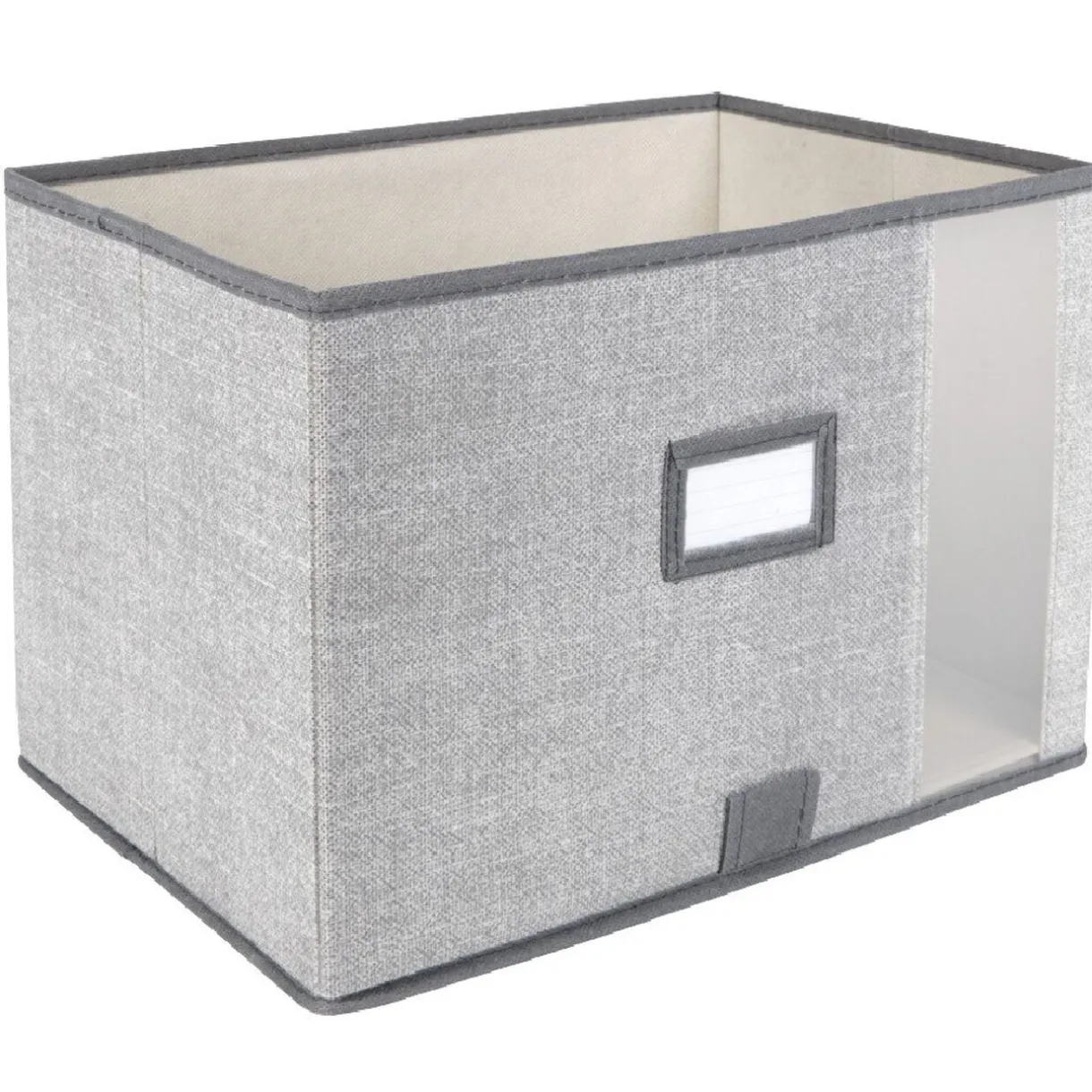 Panier de rangement à fenêtre gris, dim. 38x26x26 cm, polyéthylène. Contenu visible, emplacement pour l’étiquette.