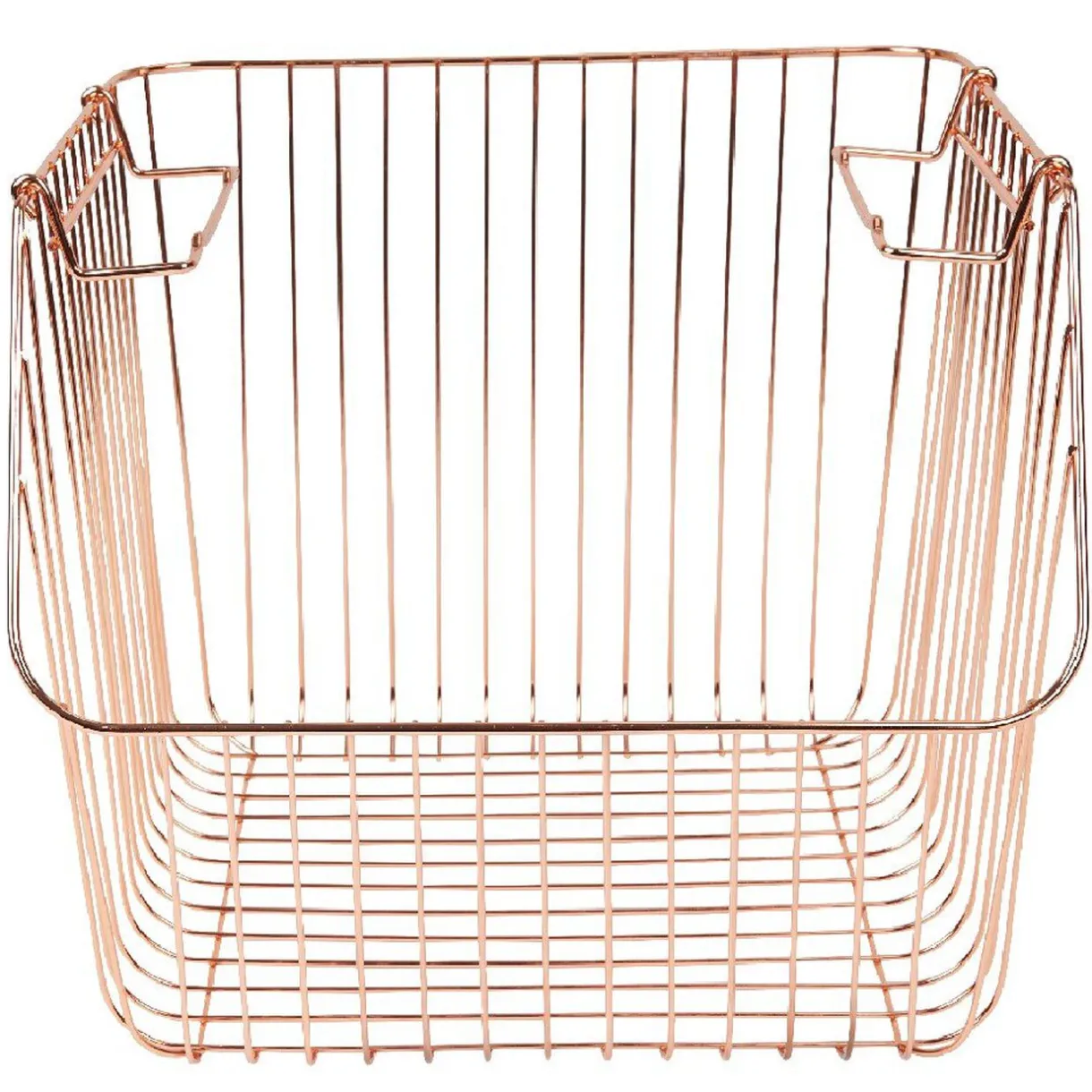 Optez pour ce panier au design filaire en métal de couleur cuivre, avec anses et superposable pour un accès direct au contenu.