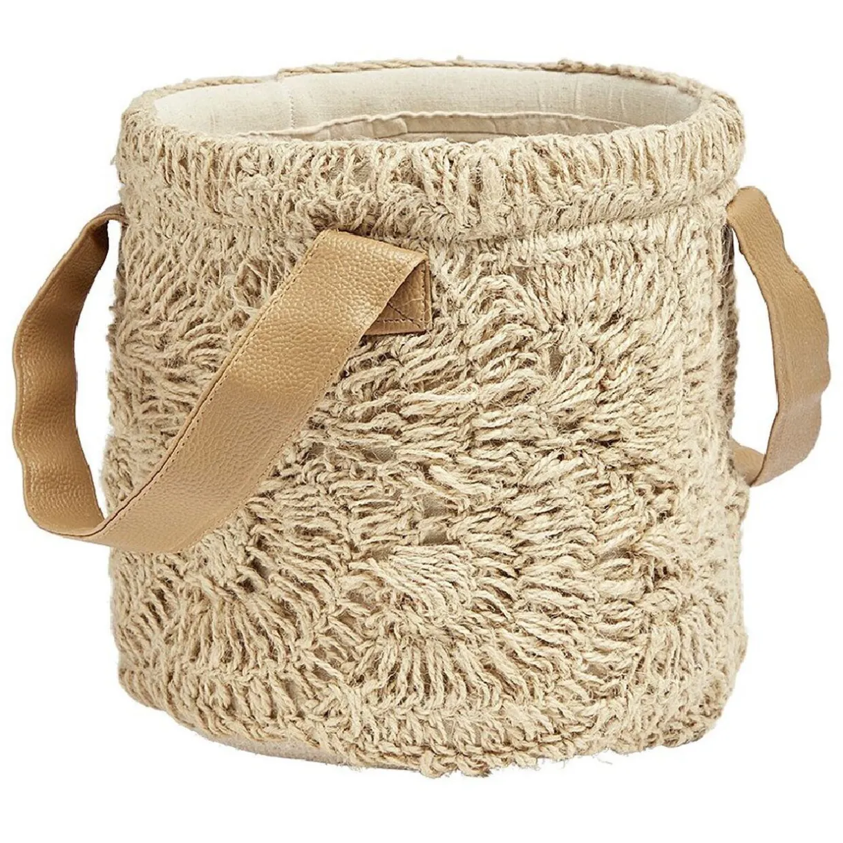 Panier de rangement style bohème, en jute et dentelle avec poignée effet cuir, trouvera sa place n’importe où dans votre intérieur avec sa teinte naturelle.