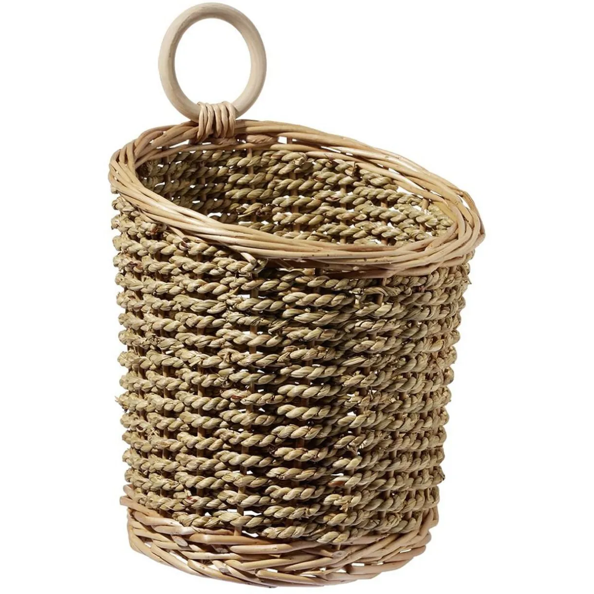 Panière à suspendre en osier marron. Décorative aussi bien avec des fleurs séchées que comme accessoire de rangement dans la cuisine ou la salle de bain.