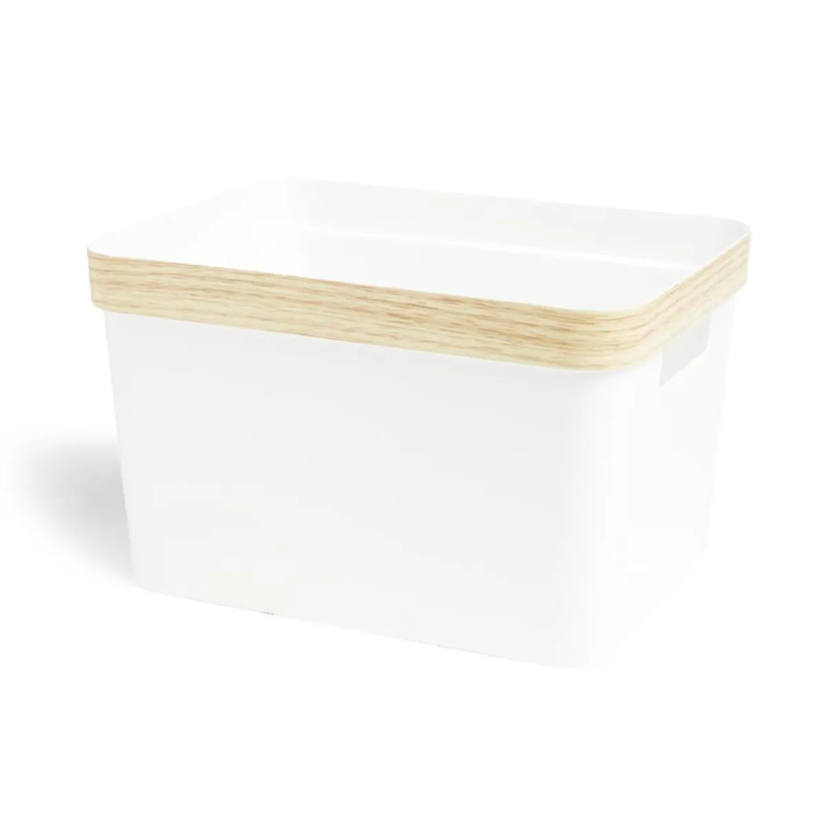 Ajoutez du style à votre rangement avec cette panière blanche dotée de rebords imitation bois.