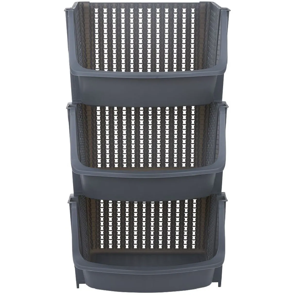 Lot de 3 panières de rangement en plastique gris superposables les unes sur les autres, pour 3 fois plus d’espace de rangement sur la même surface.
