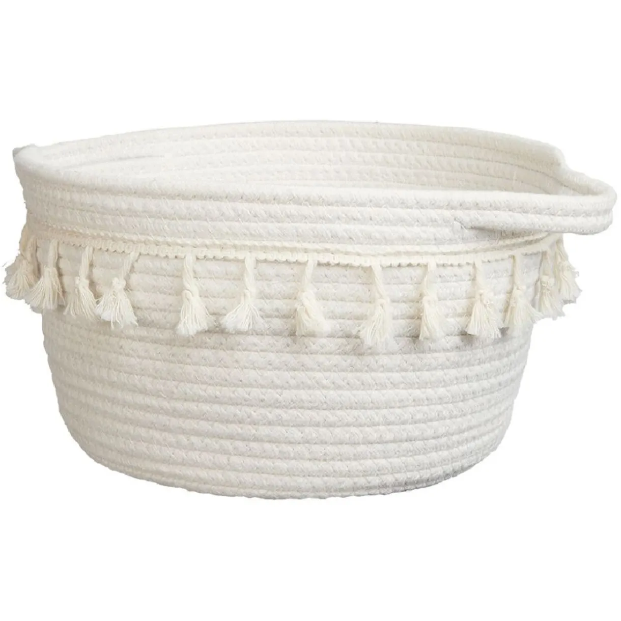 Panière déco à pompons en coton de couleur blanc naturel.