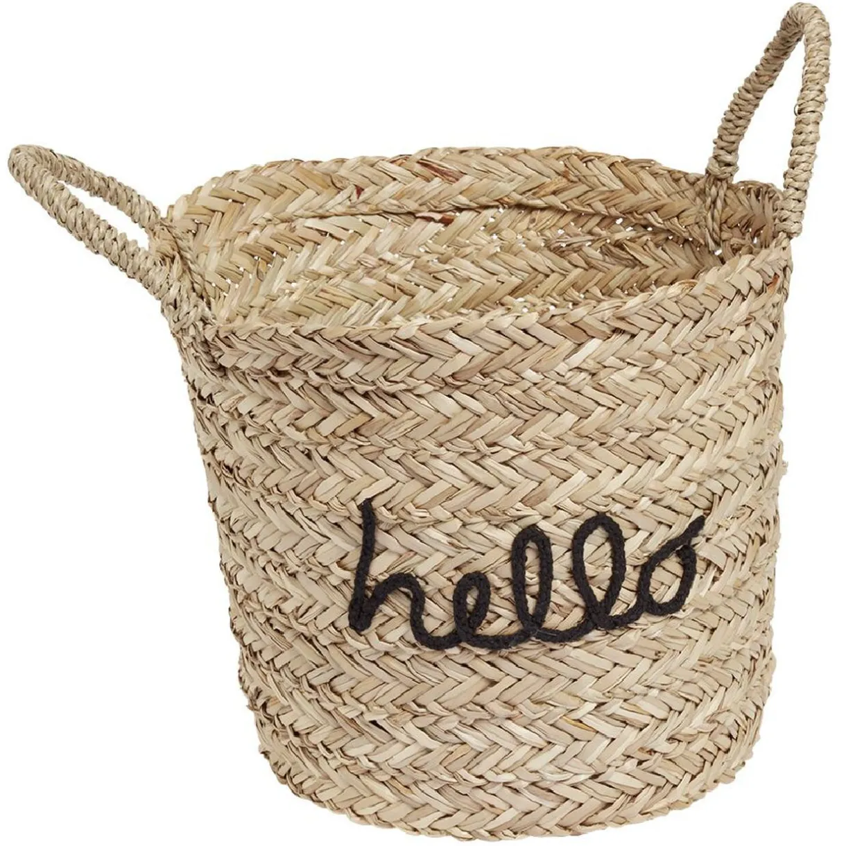Panière en jacinthe d’eau tressé couleur naturelle avec mot inscrit : Home, Hello ou Bazar, disponibilité des modèles selon stock en magasin.