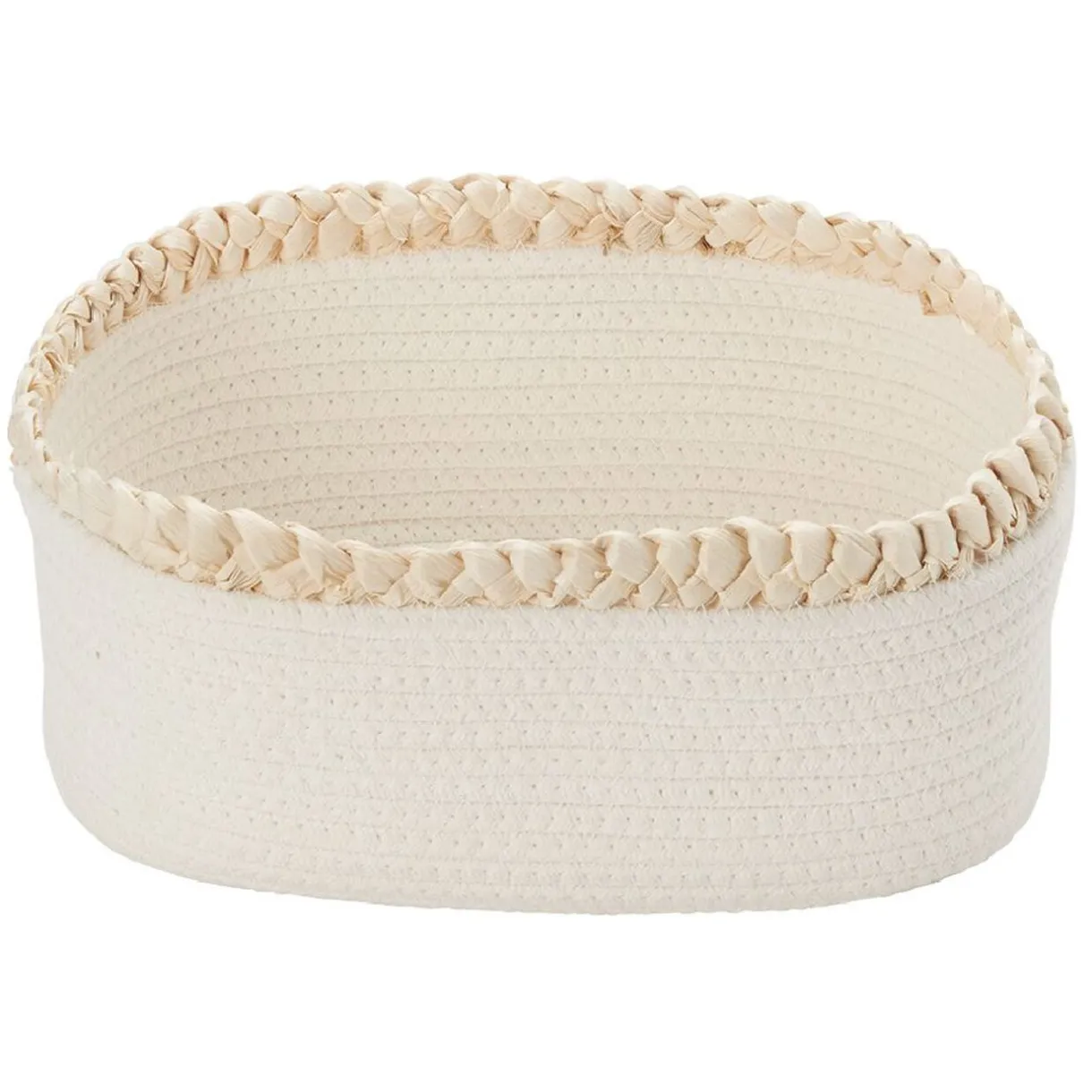 Panière rectangulaire blanche et naturelle en fibre tressée, parfaite pour organiservos affaires sur les étagères dans un style épuré et tendance.