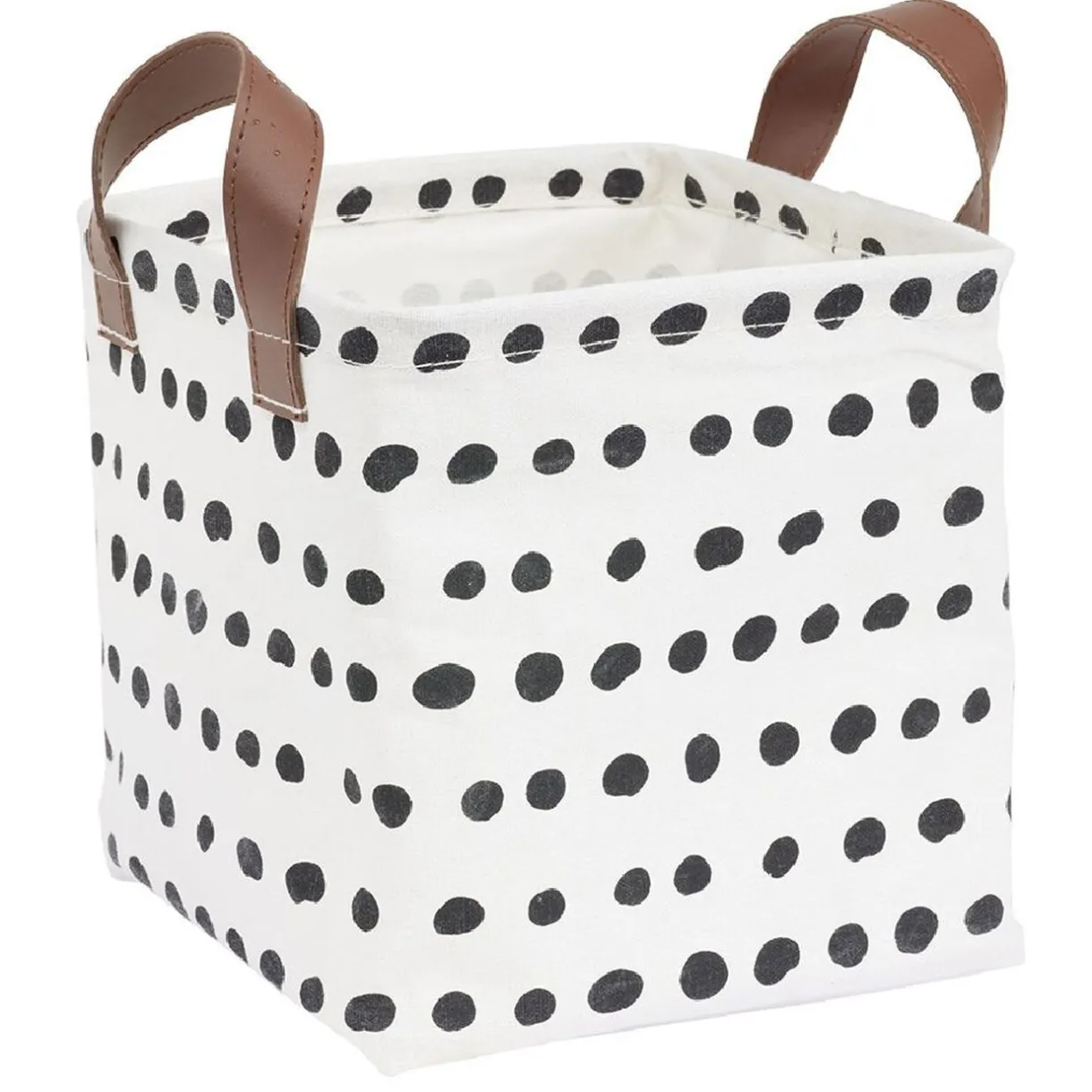 Cette panière carrée en tissu blanc à motifs pois noirs, munie de deux anses en simili marron, est idéale pour ranger vos petits objets du quotidien.