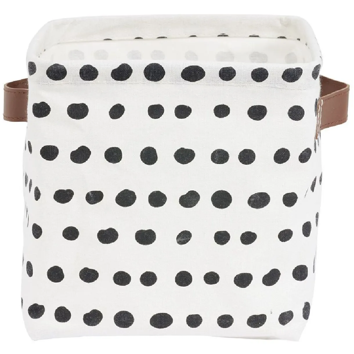 Panière carrée en tissu blanc à motifs pois noirs avec poignée simili marron.