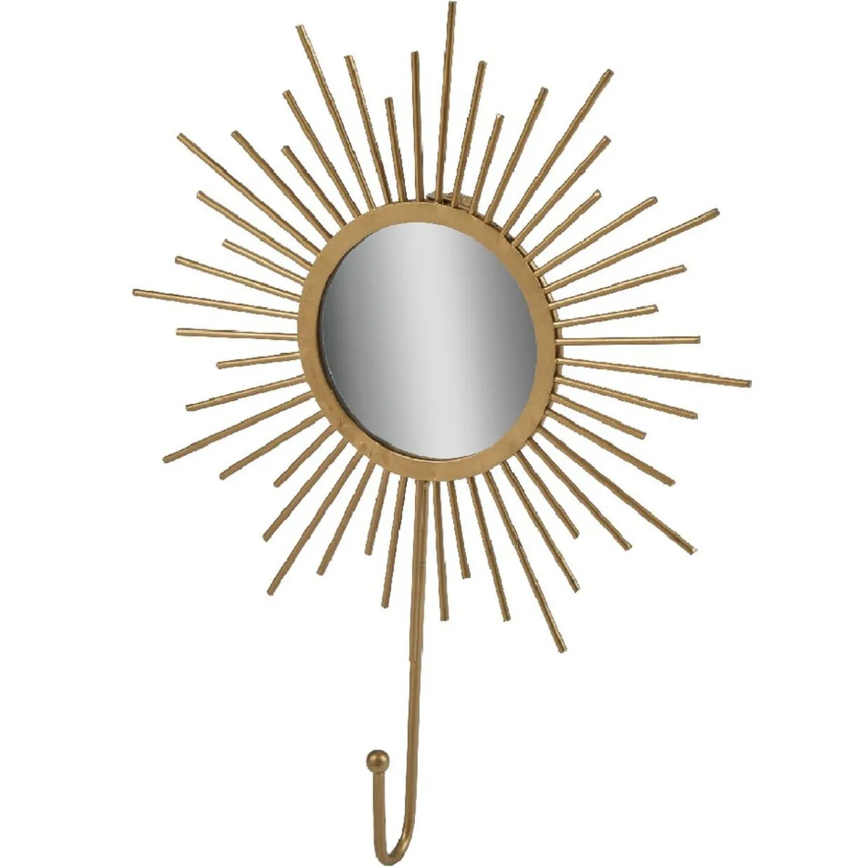 Patère déco avec miroir en forme de soleil. Design en métal doré, idéal pour illuminer la décoration d’une chambre ou d’un couloir.