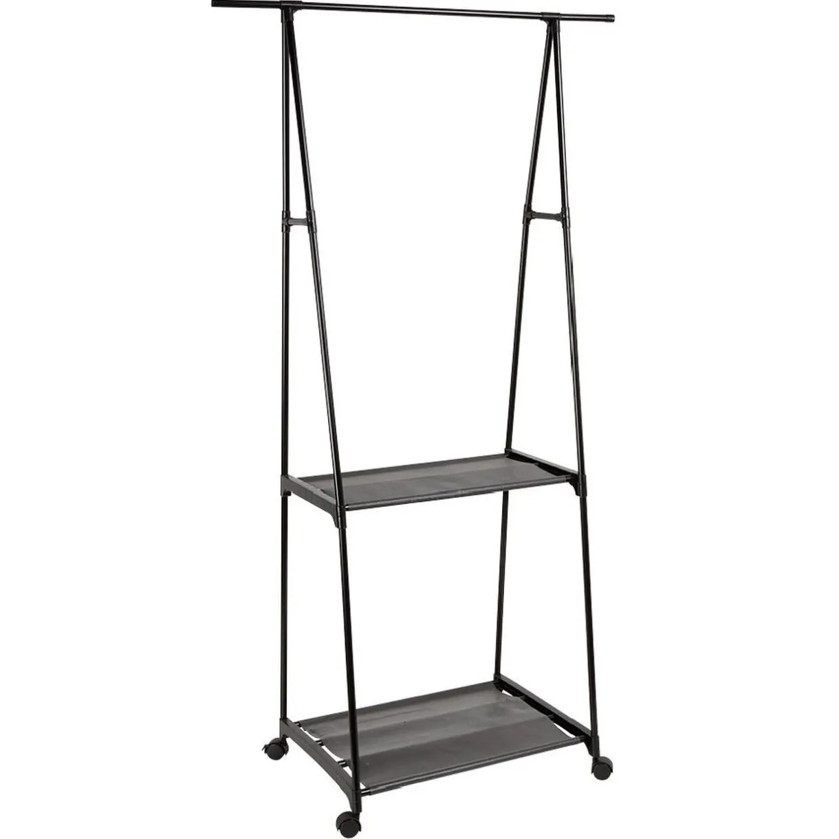 Portant à vêtements avec 2 tablettes en métal noir, facile à déplacer grâce à ses 4 roulettes.