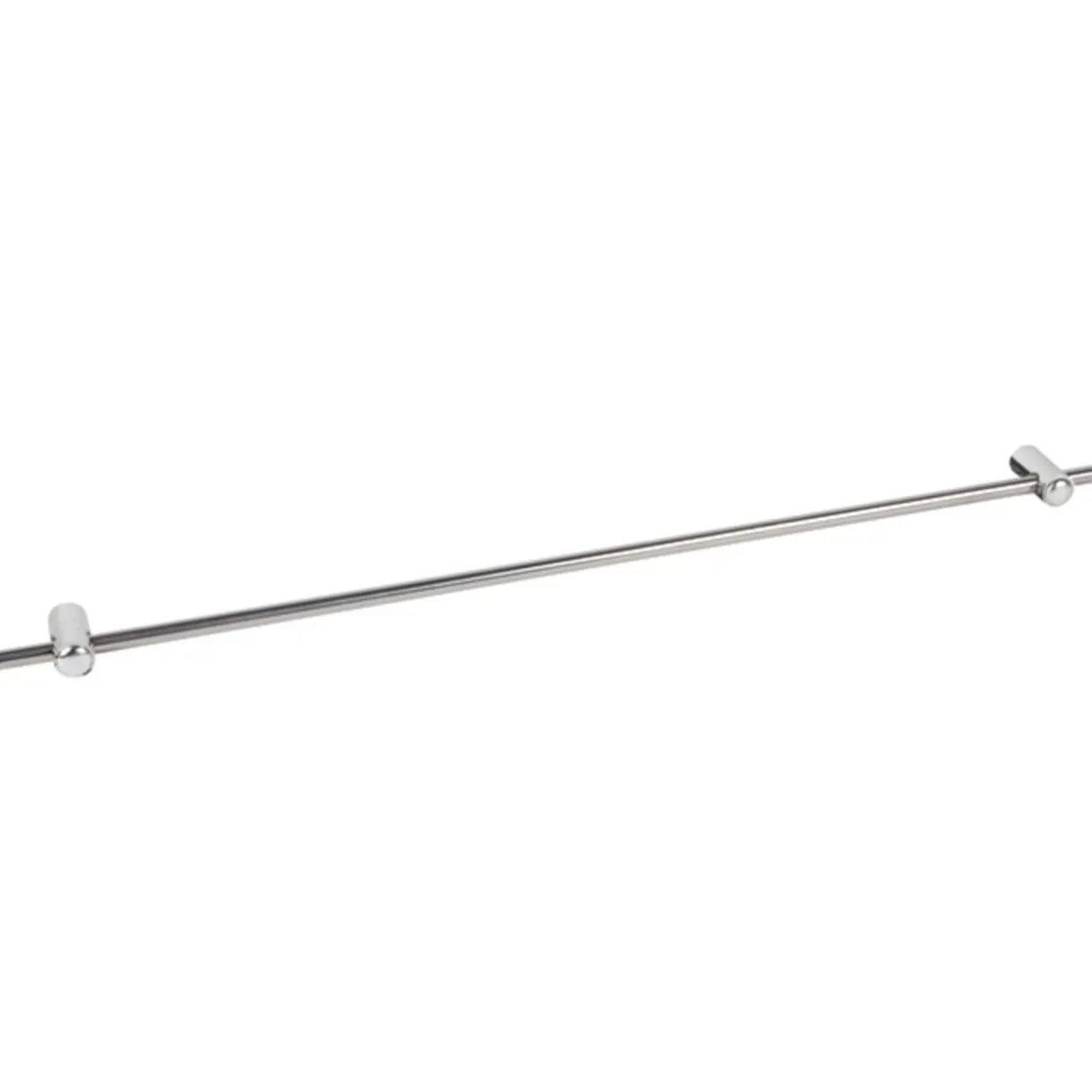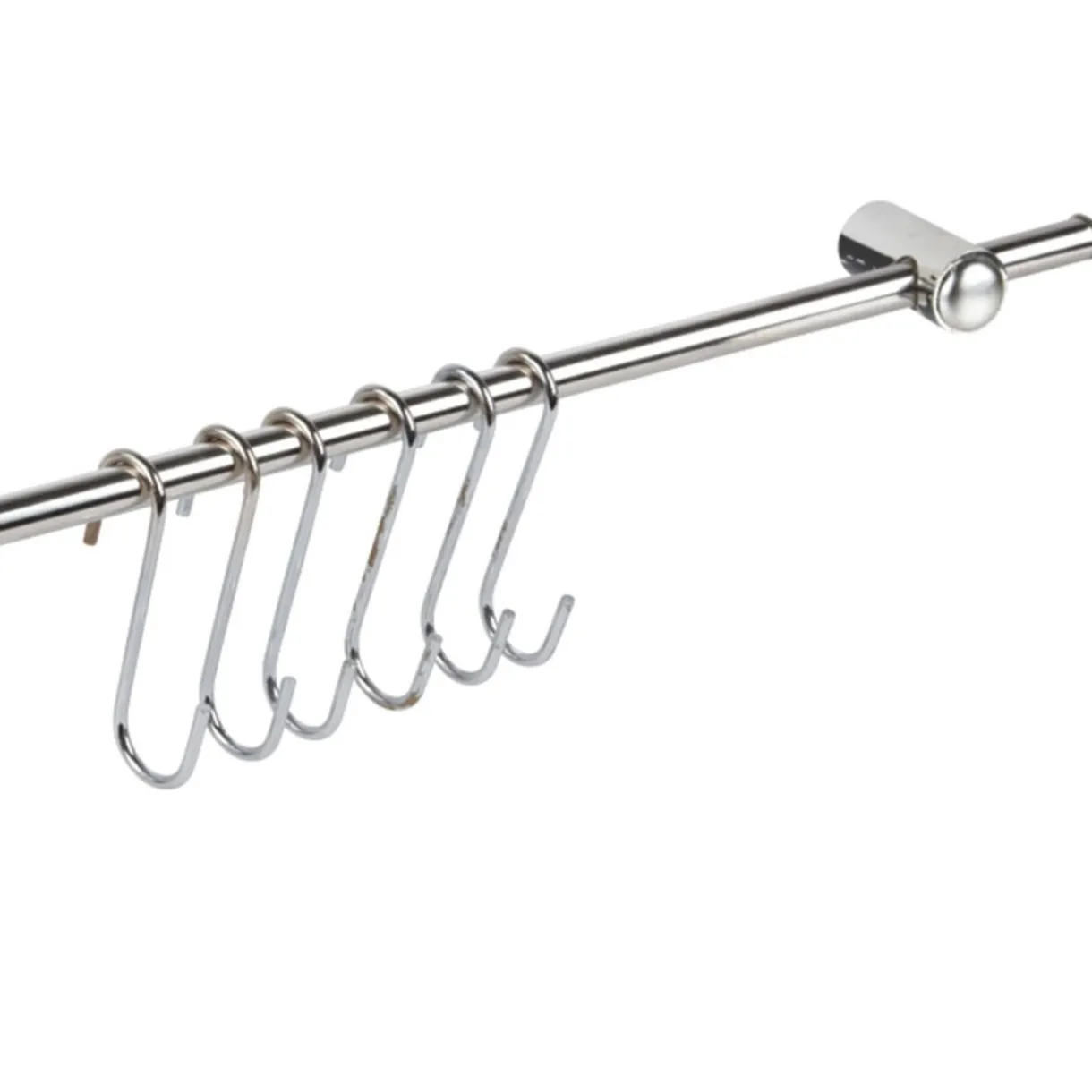 Rangement de cuisine à suspendre contenant : 1 support essuie-tout, 6 crochets, 2 barres L. 58 cm avec système d’accroche et 1 étagère, métal chromé.
