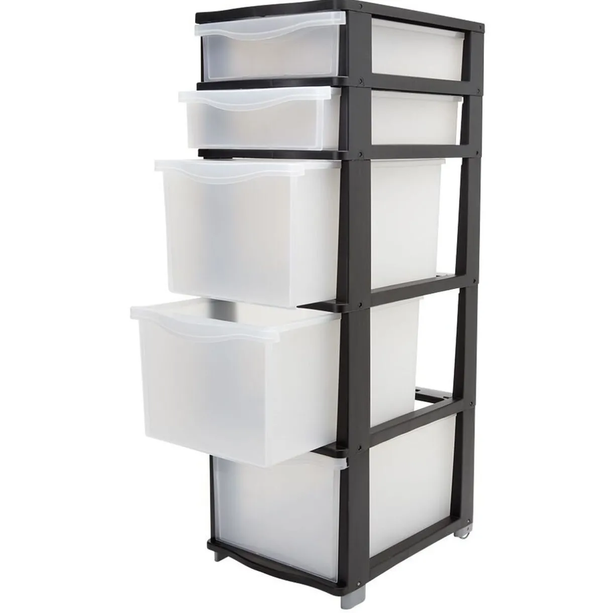 Tour de rangement en plastique blanc transparent avec armature noire.