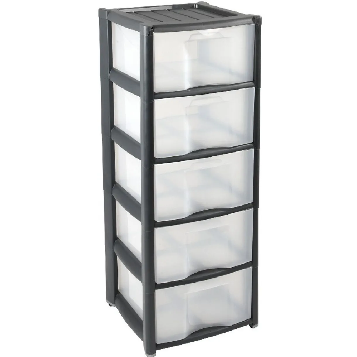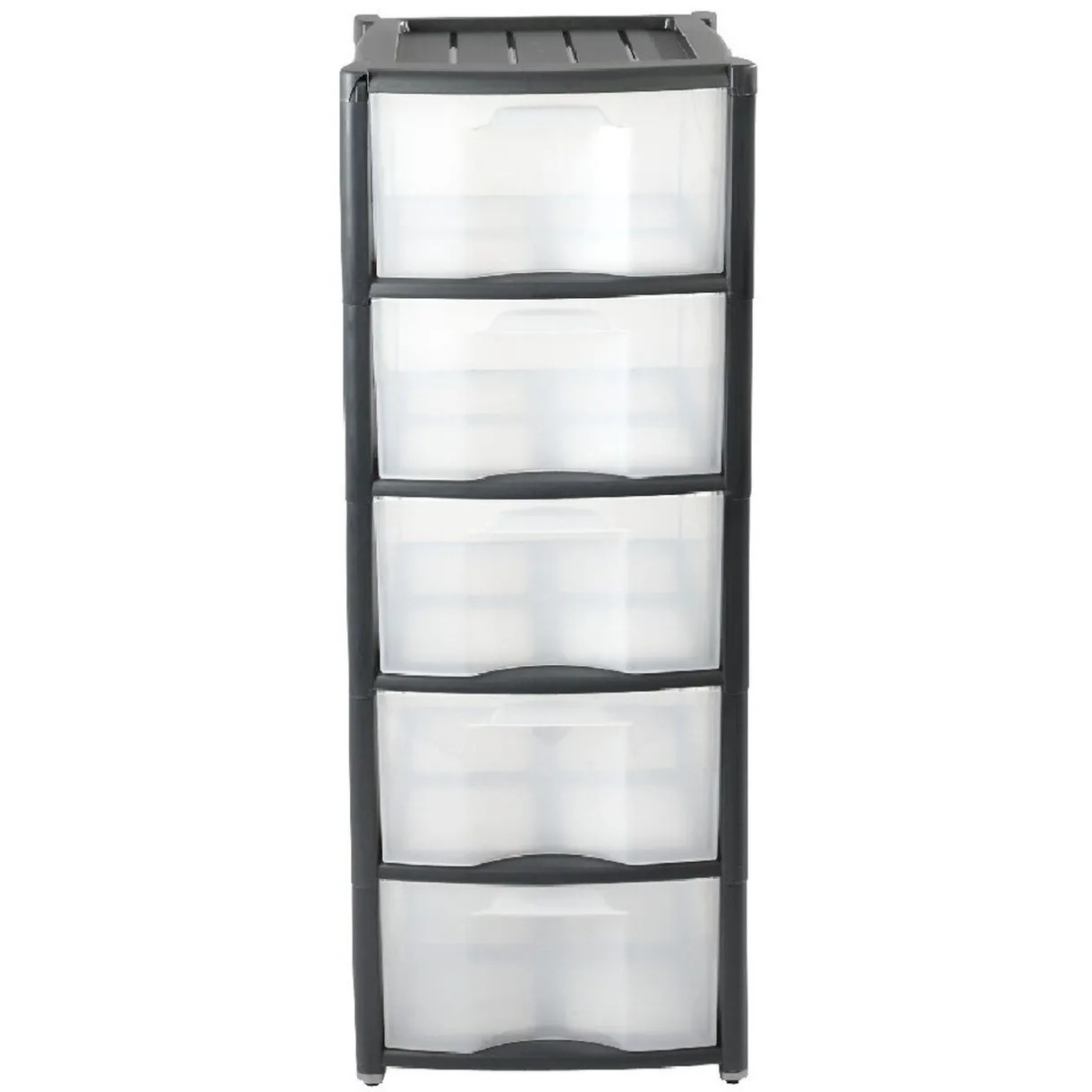 Tour de rangement noir 5 tiroirs, dim. 37x29x95 cm, plastique. Tiroirs transparents : contenu visible, à roulettes : se déplace facilement.