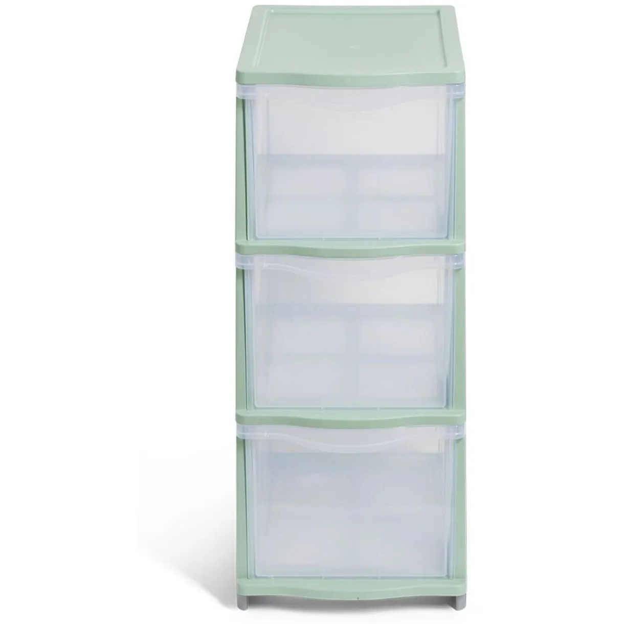 Cette tour de rangement en plastique mesure 27x37x63 cm et comporte trois tiroirs.