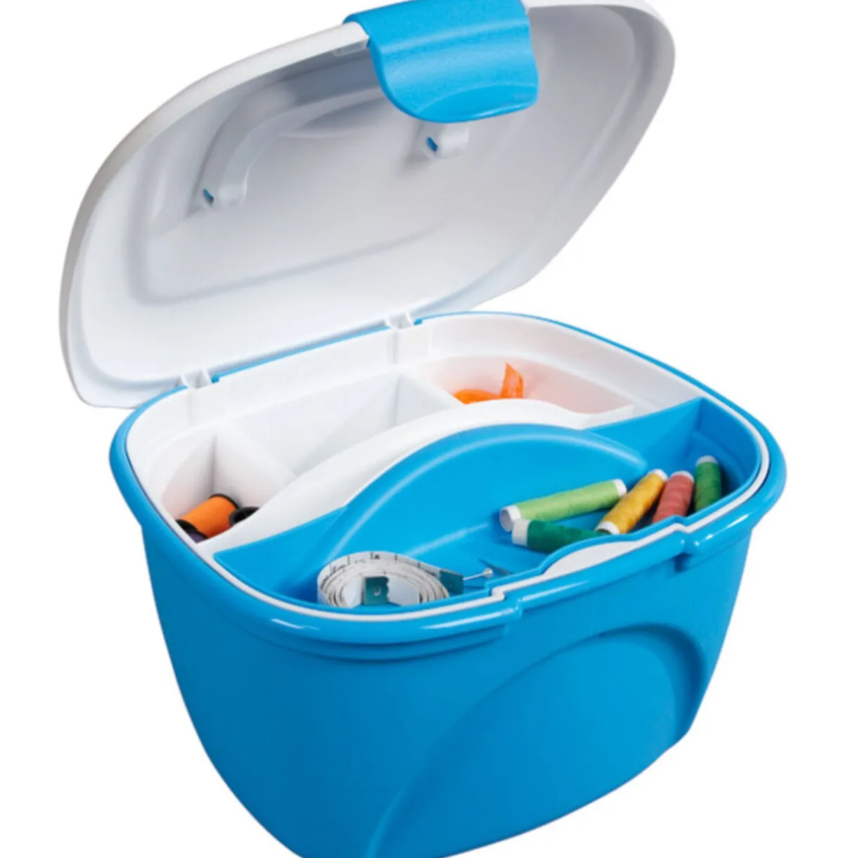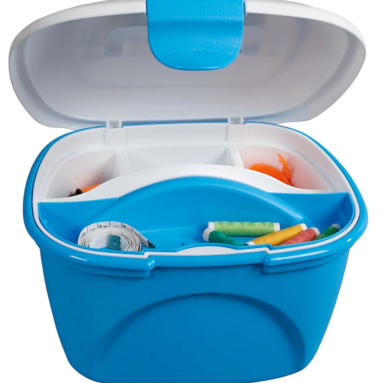Vanity bleu, dim. 27,5×23,5×17 cm, compartiments amovibles, poignée et couvercle à clip, plastique.